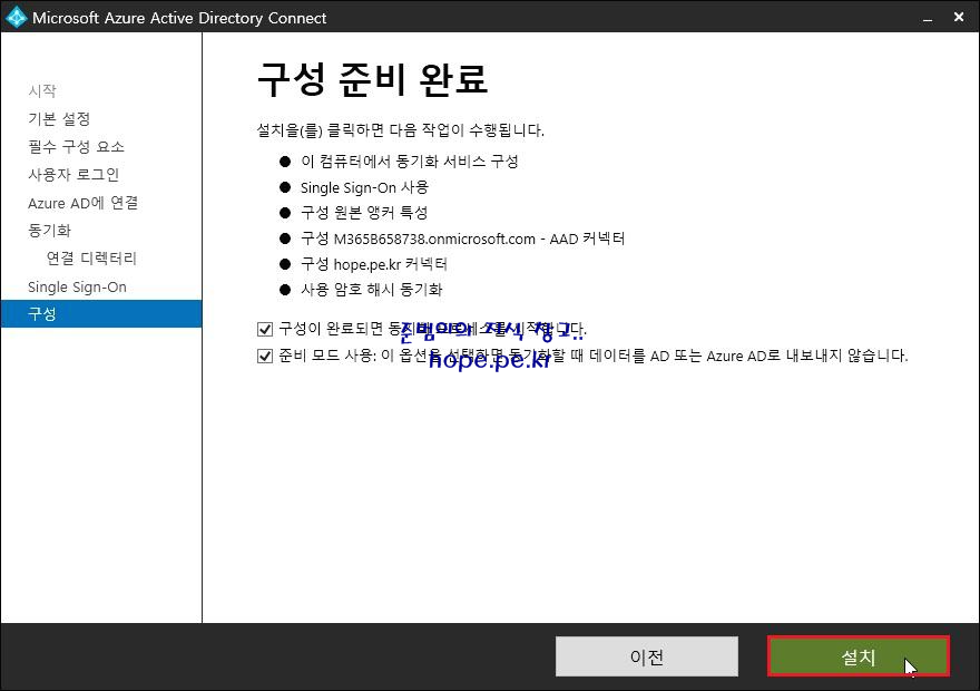 구성 준비 완료 화면에서, ‘준비 모드 사용’ 에 체크가 되어 있음을 확인후 ‘설치’ 를 클릭 합니다.