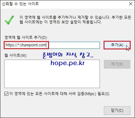 신뢰할 수 있는 사이트 창에서, 영역에 웹 사이트 추가에 'https://*.sharepoint.com' 입력후 '추가' 를 클릭 합니다.