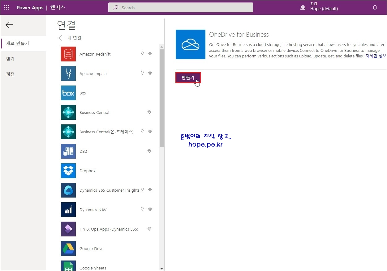 새로 만들기 > 연결 화면에서, Excel 파일을 불러오기 위한 커넥터를 지정해야 합니다. 최초 접속시 OneDrive for Business로 지정됩니다. '만들기'를 클릭합니다. cf) 500개 이상의 다른 커넥터를 연결할수 있으며, 자체 커넥터 만들기도 가능합니다.