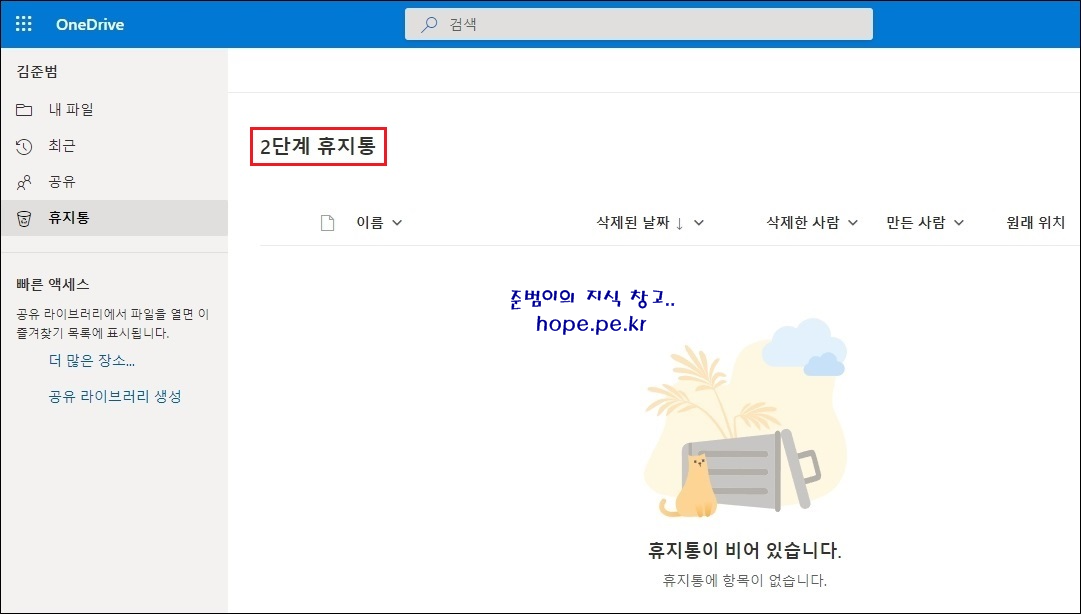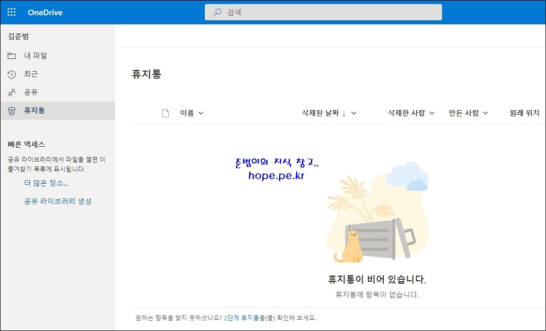 해당 사용자의 휴지통 화면을 새로 고침 하면 다음과 같이 휴지통이 깨끗하게 비워졌음을 확인할 수 있습니다.