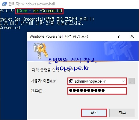 다음 명령어 입력 > Windows PowerShell 자격 증명 요청 창에서, '관리자 계정 정보 입력' 후 '확인' 을 클릭 합니다.