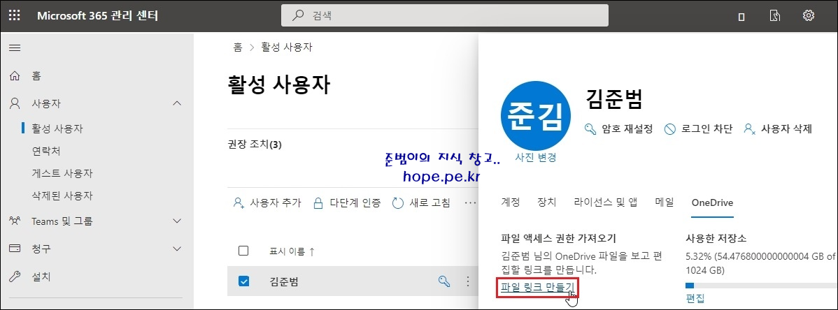Microsoft 365 관리 센터에서, 해당 사용자의 OneDrive 메뉴에서, '파일 링크 만들기' 를 클릭하여 해당 사용자의 OneDrive 파일의 액세스 권한을 가져오면 됩니다.