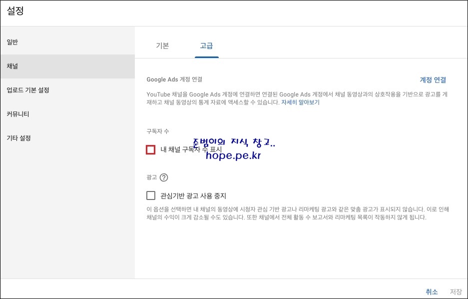 이전에는 Youtube 채널의 구독자수를 채널 설정의 '내 채널 구독자 수 표시'를 체크 해제 함으로써, 숨기기가 가능 했었습니다.