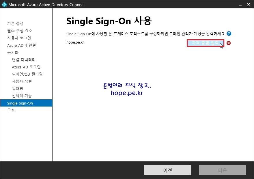 Single Sing-On 사용 화면에서, '자격 증명 입력' 을 클릭 합니다.