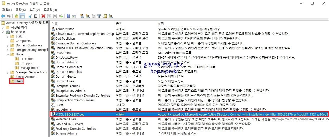 cf3) Active Driectory 사용자 및 컴퓨터 콘솔의 'Users' 컨테이너에 'MSOL_oooooooooo' 계정도 추가 되었음을 확인할 수 있습니다.