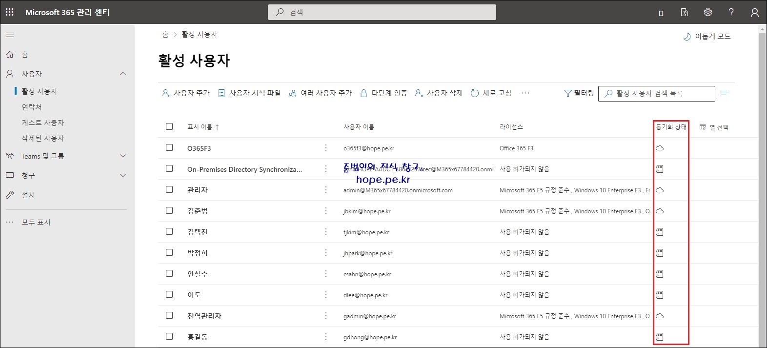 최초 동기화 이후 'Microsoft 365 관리 센터 > 사용자 > 활성 사용자' 페이지를 확인해 보면, On-Premise 'hope.pe.kr > Hope > IT Support' OU의 구성원인 김택진, 박정희, 안철수, 이도, 홍길동 사용자와 On-Premises Directory Synchronization Service Account 계정, 6개의 계정이 동기화 되어 추가 되었음을 확인할 수 있습니다.