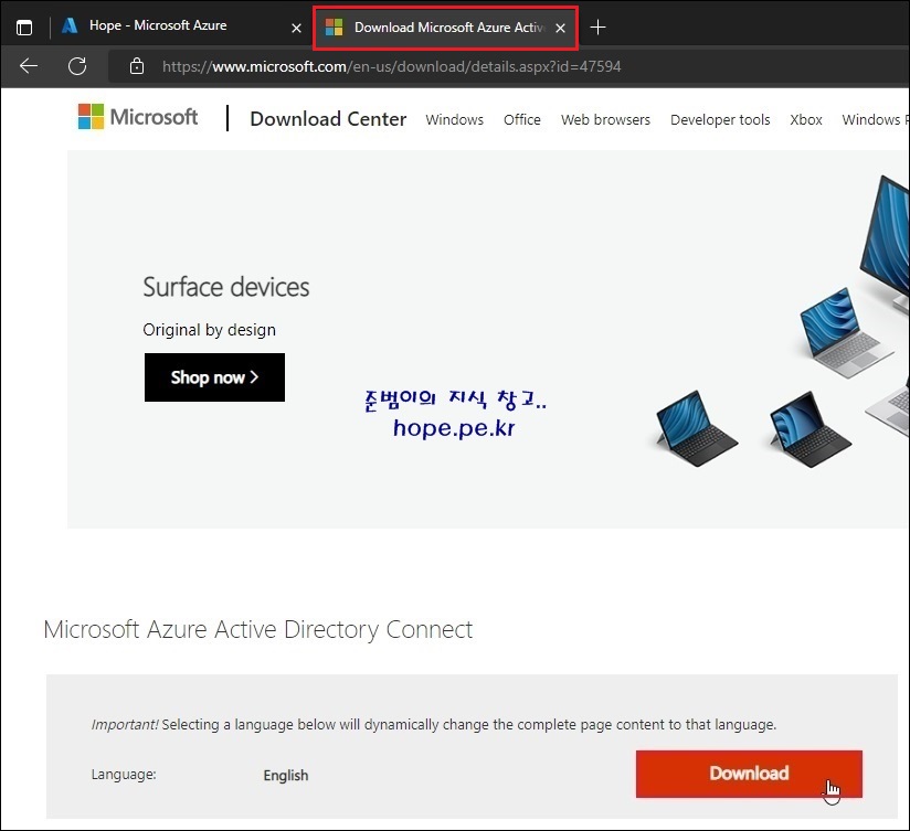 Microsoft Azure Active Directory Connect 다운로드 사이트가 새 탭으로 열리면, 'Download' 를 클릭 합니다.