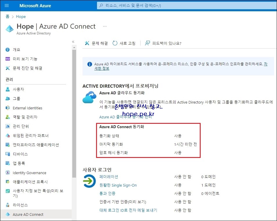 cf2) Azure AD Connect 페이지를 다시 확인해보면, Azure AD Connect 동기화 영역의 동기화 상태가 사용으로, 마지막 동기화가 1시간 미만 전으로, 암호 해시 동기화가 사용으로 변경 되었음을 확인할 수 있습니다.