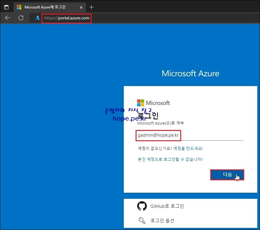 다음으로, 웹브라우저에서 Azure 포탈 사이트(https://portal.azure.com) 접속후 관리자 계정으로 로그인을 진행 합니다.
