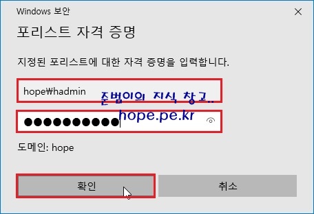 Windows 보안 창에서, '포리스트 관리자의 계정' 및 '암호' 입력후 '확인' 을 클릭 합니다.