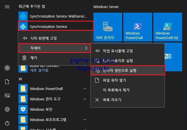 Azure AD Connect 설치후 '시작 > 최근에 추가한 앱' 을 확인해보면, Azure AD Connect 프로그램이 설치되었고, 관련 아이콘들을 확인할 수 있습니다. 'Synchronization Serivce' 에서 우클릭후 '자세히 > 관리자 권한으로 실행' 을 클릭 합니다.