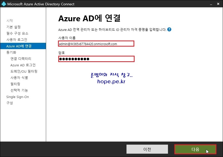 Azure AD에 연결 화면에서, 'Azure AD 전역 관리자 (or Microsoft 365 전역 관리자) 계정' 및 '암호' 입력후 '다음' 을 클릭 합니다.