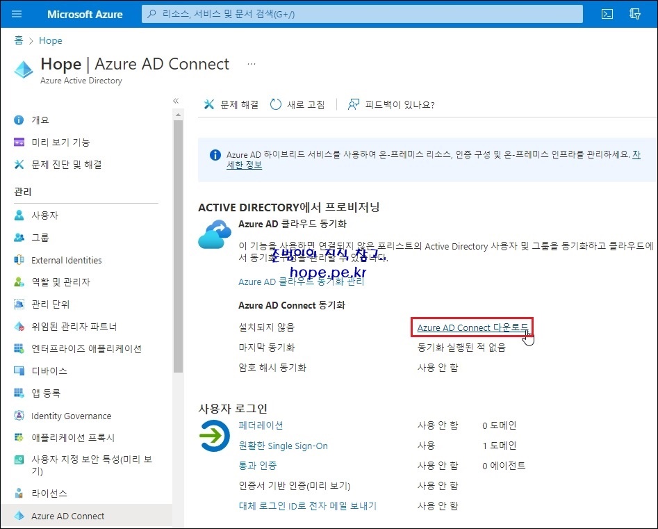 개요 페이지에서, 'Azure AD Connect' 를 클릭 합니다.