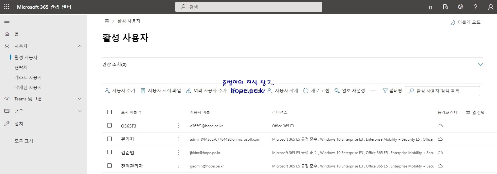 먼저 동기화 이전, 'Microsoft 365 관리 센터 > 사용자 > 활성 사용자' 페이지 화면 입니다.