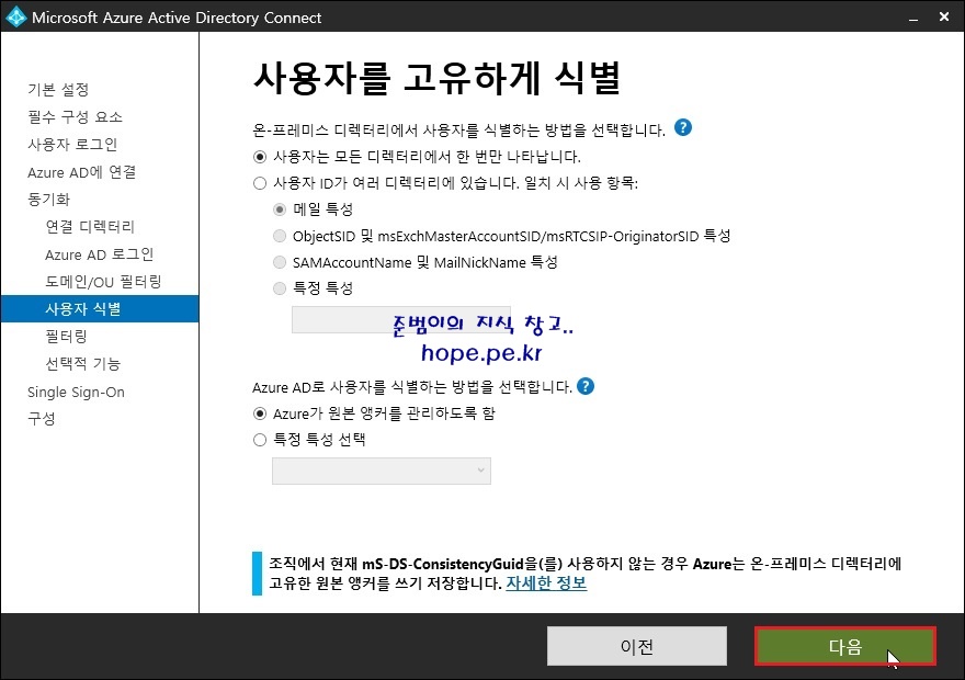 사용자를 고유하게 식별 화면에서, '다음' 을 클릭 합니다.