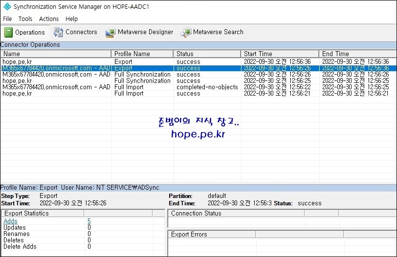 Synchronization Serivce Manager 창의 Operations 탭 에서, 최초 동기화가 진행 되었음을 확인할 수 있습니다.