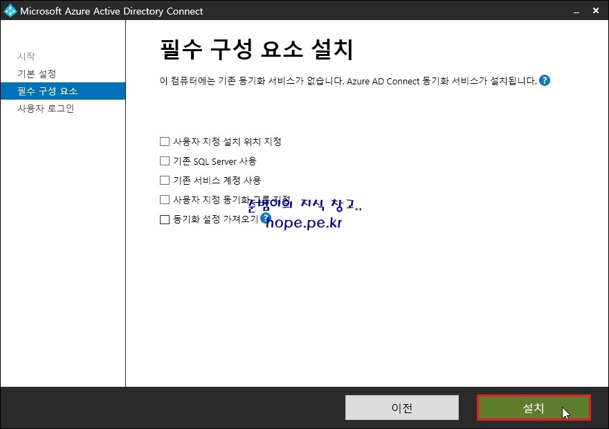 Cf) 본 포스팅에서는 Azure AD Connect 설치를 사용자 지정의 기본 옵션으로 간단한 설치를 진행 하였습니다. 설치 과정중 다양한 옵션에 대한 자세한 설명은 'Azure Active Directory Connect 사용자 지정 설치' 사이트 내용을 참고 부탁 드립니다.