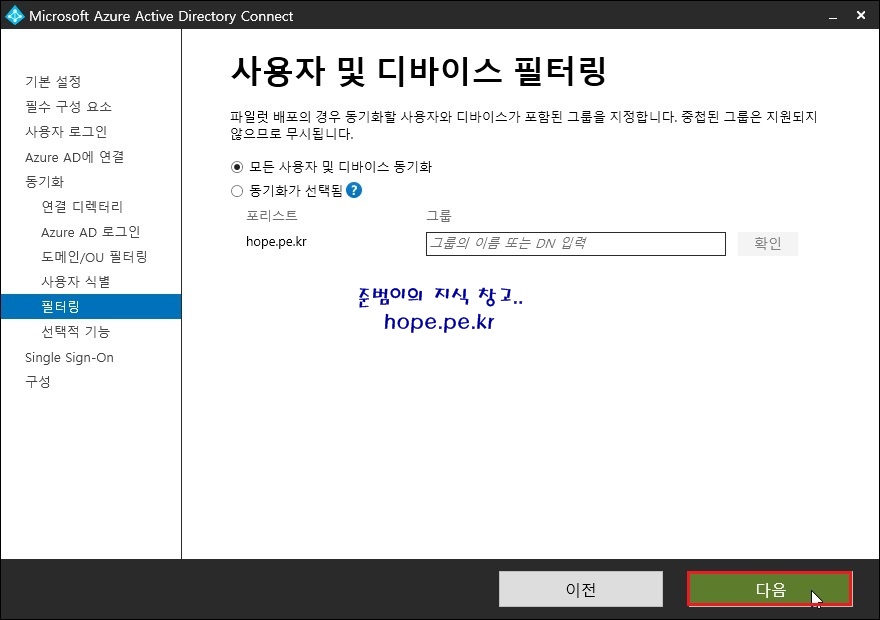 도메인 및 OU 필터링 화면에서, 동기화를 진행하고자 하는 OU 선택후 '다음' 을 클릭 합니다.
