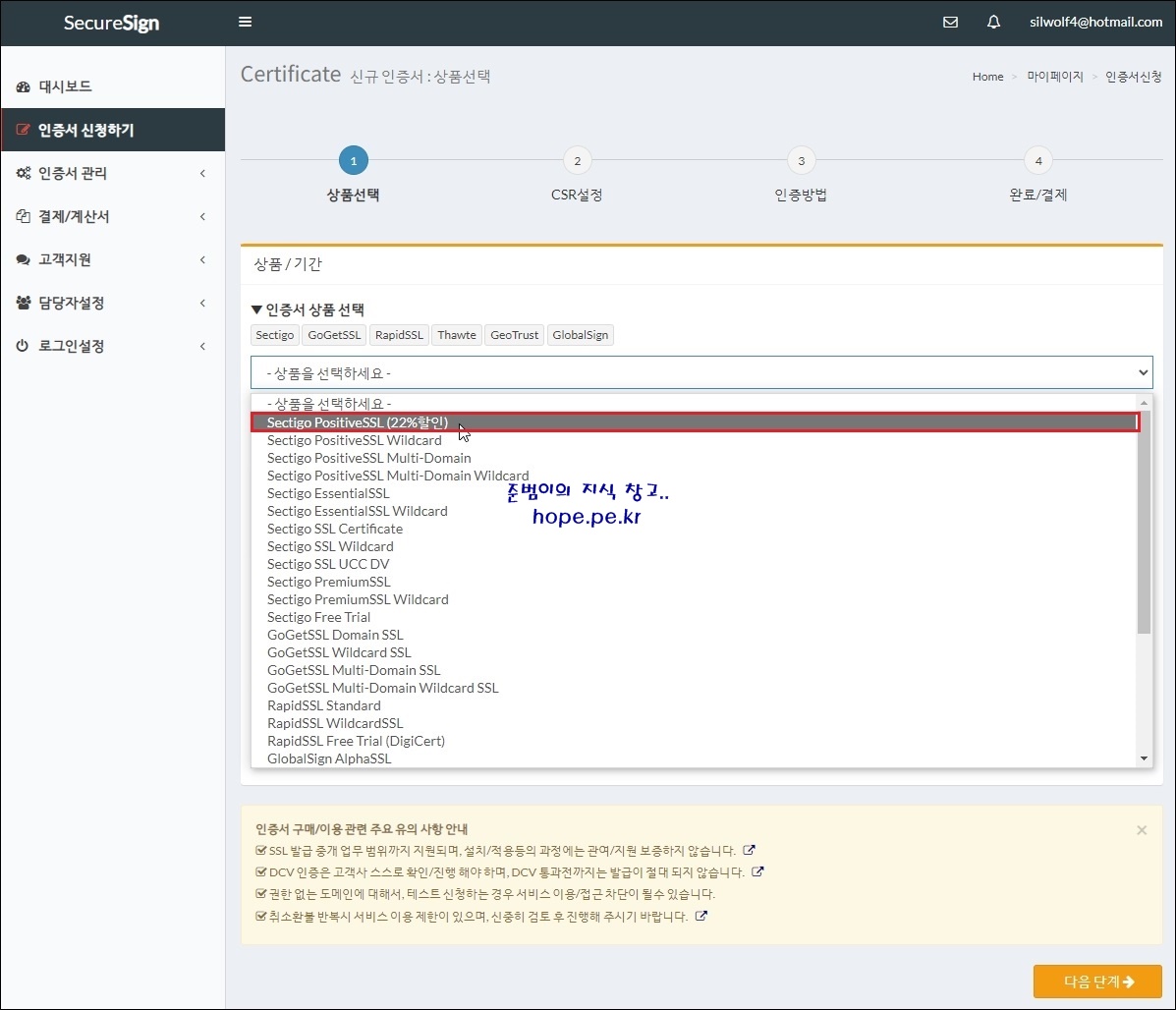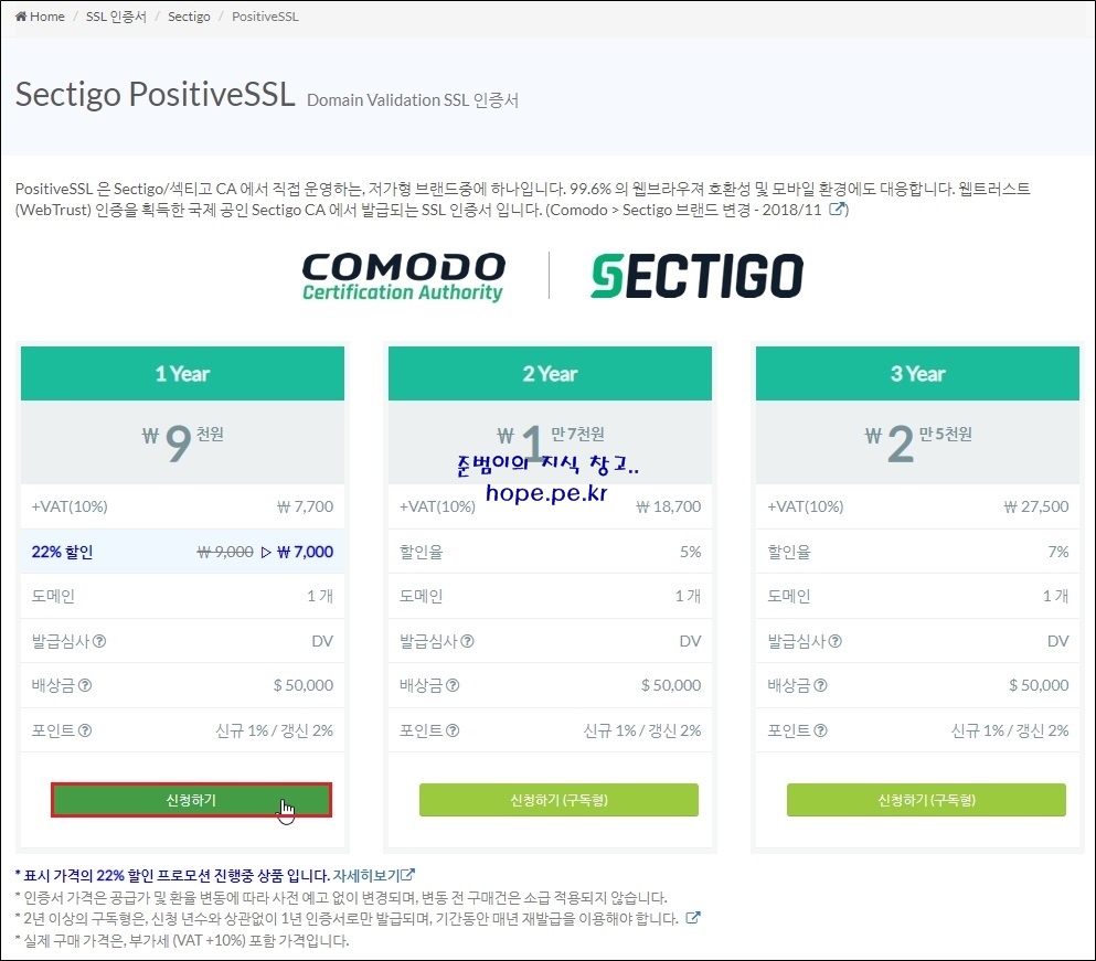 인증서 상품을 선택 합니다. 저는 22% 할인중인 상품인 'Sectigo PositiveSSL (22%할인)' 상품을 선택 했습니다.