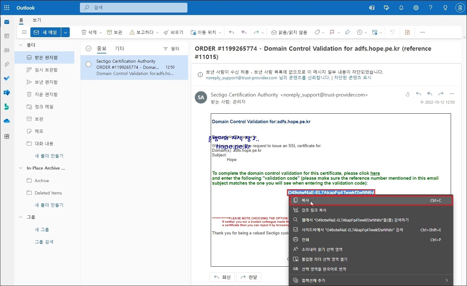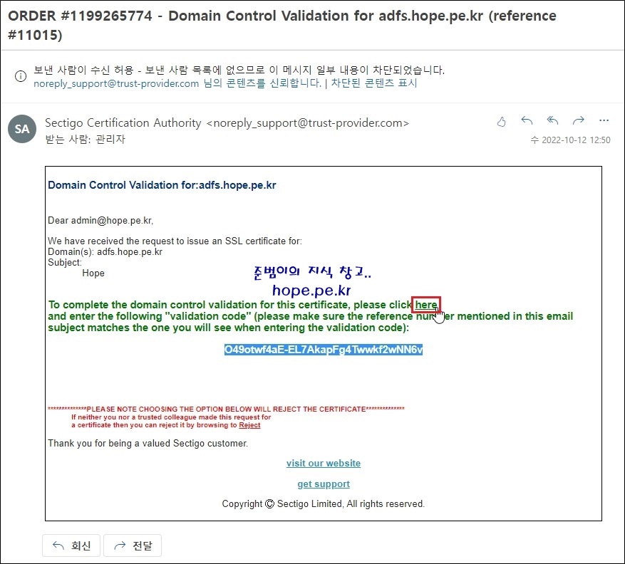 '기본 CN 인증 방법 단계' 에서 지정한 메일로 아래와 같은 메일이 도착하면, 'validation code' 를 복사후