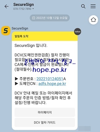 그리고 카카오톡으로 DCV(도메인권한검증) 절차 진행 관련 알림톡이 도착 합니다.