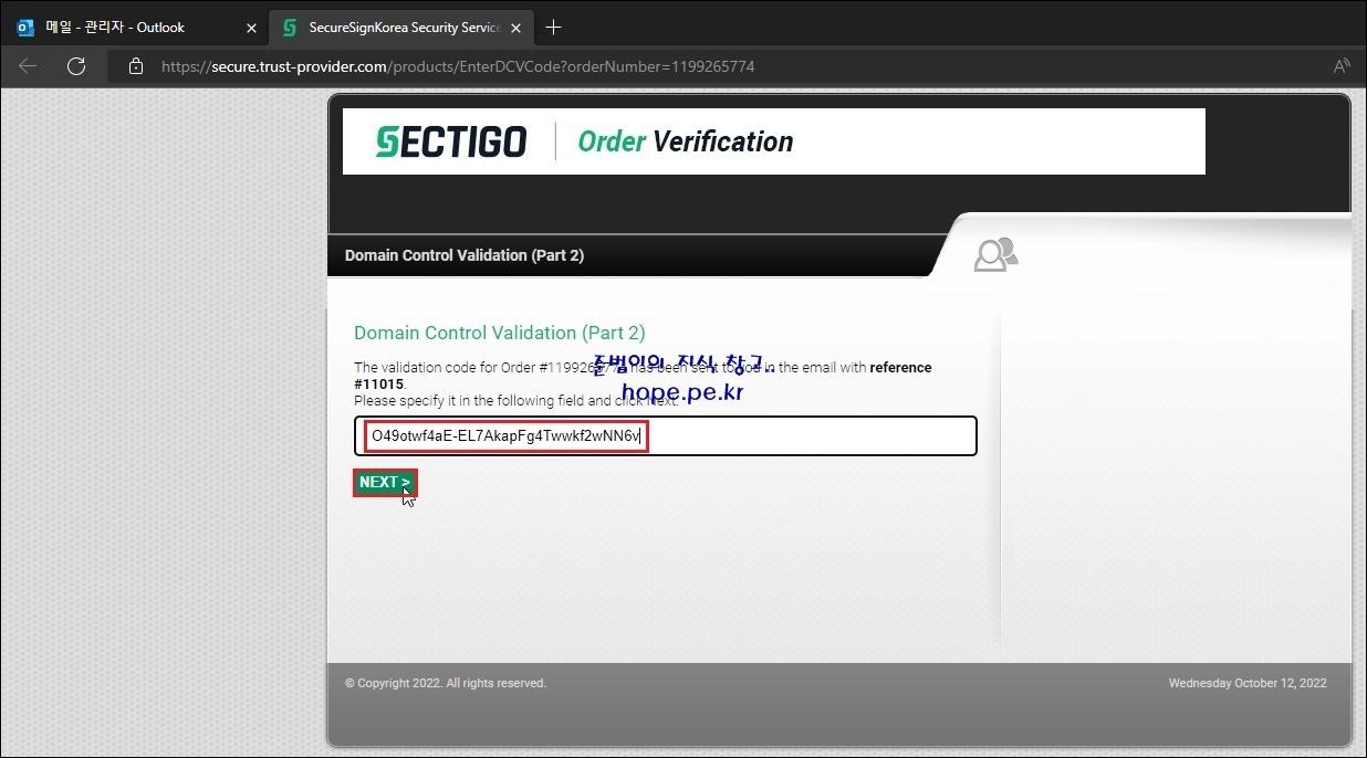 새 탭으로 SECTIGO Order Verification 페이지가 열리면 '복사한 코드를 붙여넣기' 후 'Next' 를 클릭 합니다.