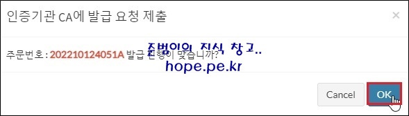 인증기관 CA에 발급 요청 제출 메세지에서, 'OK' 를 클릭 합니다.