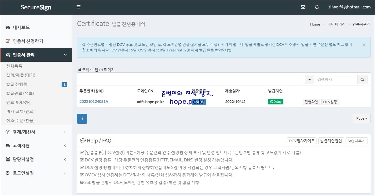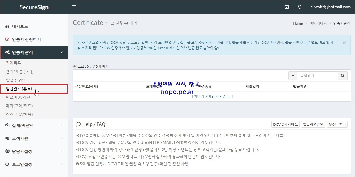 인증서 관리 > 발급 진행중 화면이 발생 합니다.