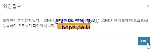 만약 DNS 조회가 되지 않는 경우 아래와 같은 에러 메세지가 발생 합니다.