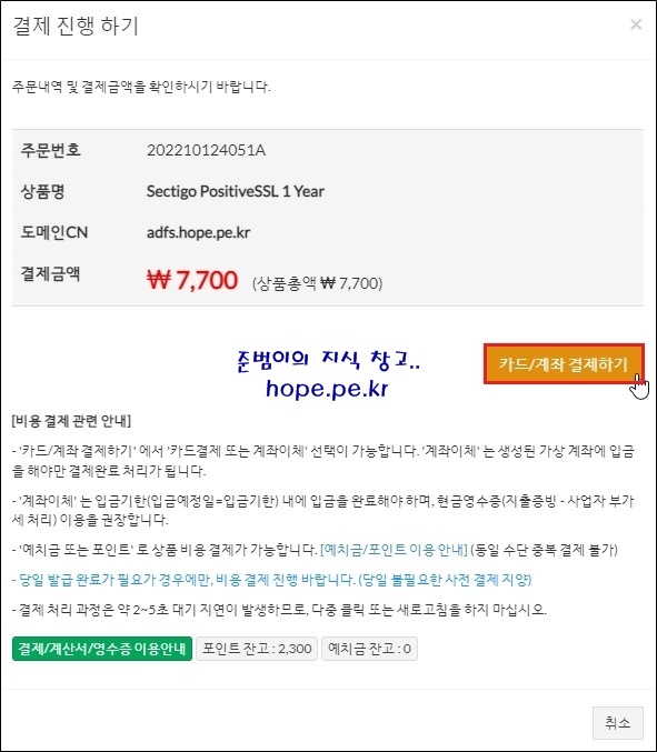 결제 진행 하기 창에서, '카드/계좌 결제하기' 를 클릭하여 결제 단계를 진행, 완료 합니다.