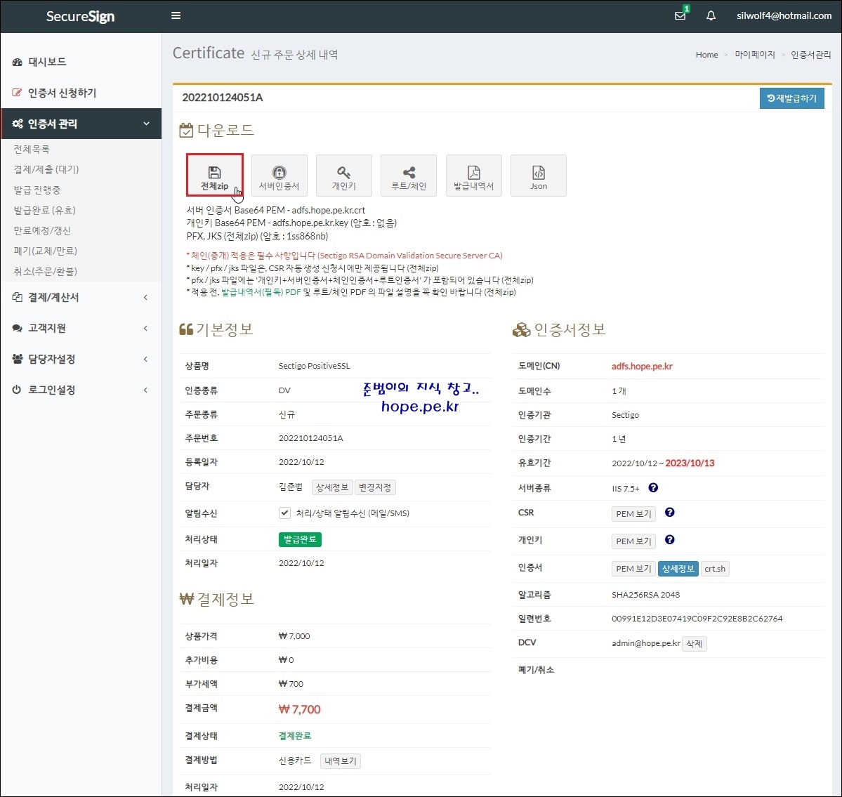 인증서를 정상적으로 다운로드 할 수 있습니다.