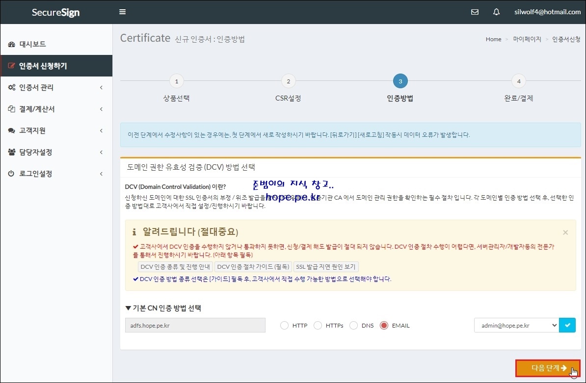 CSR설정 화면에서, 구매하고자 하는 '도메인 이름' 입력후, '웹서버 종류 선택' 선택후 'CSR 자동생성 선택'의 정보 입력후 '다음 단계' 를 클릭 합니다.