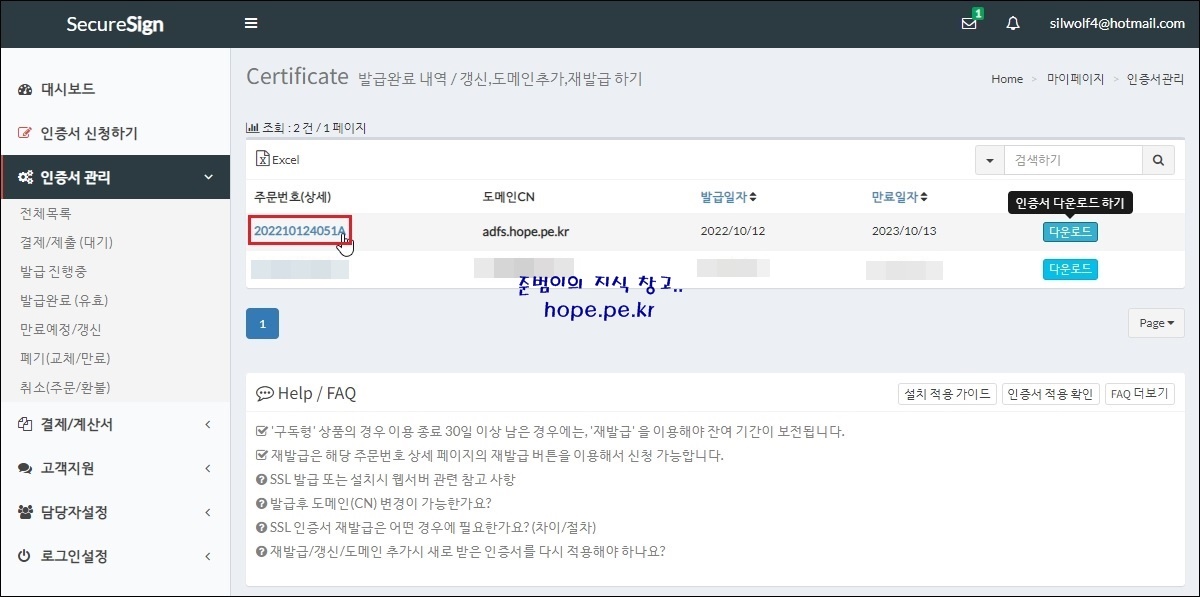 인증서를 정상적으로 다운로드 할 수 있습니다.
