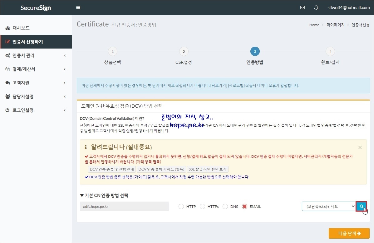 CSR설정 화면에서, 구매하고자 하는 '도메인 이름' 입력후, '웹서버 종류 선택' 선택후 'CSR 자동생성 선택'의 정보 입력후 '다음 단계' 를 클릭 합니다.