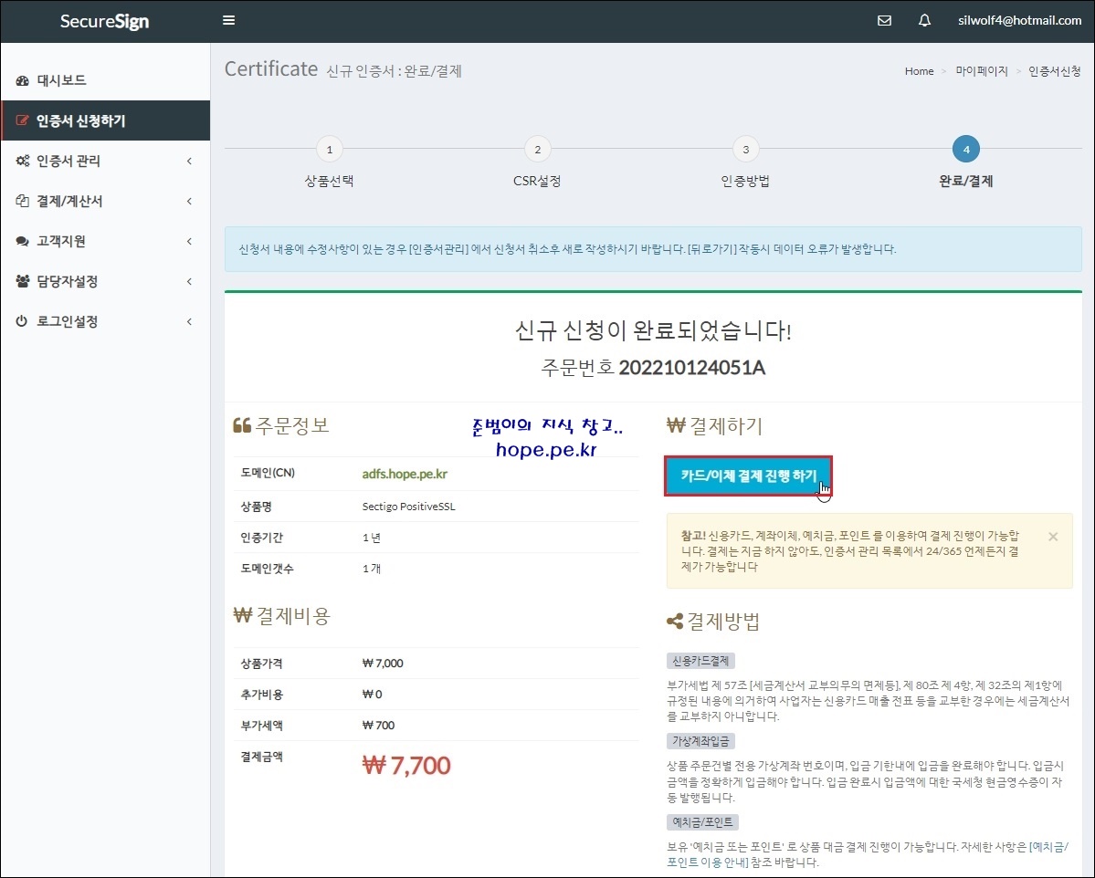 이에 저는 인증서가 필요할 때 마다 유료 인증서 사이트에서 구매를 하곤 합니다. 이번에도 인증서가 필요해서 구매를 진행 했는데, 해당 과정을 간략하게 포스팅 합니다.