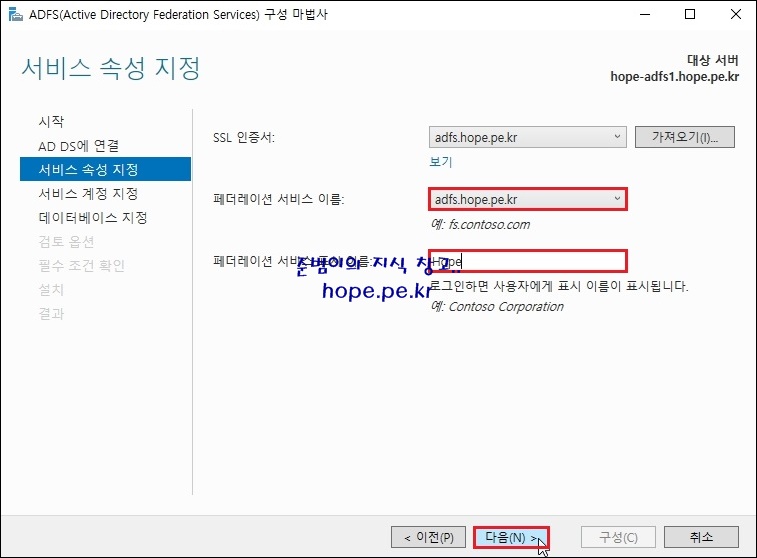 '페더레이션 서비스 이름' 입력 후 '페더레이션 서비스 표시 이름' 입력 후 '다음' 을 클릭 합니다.