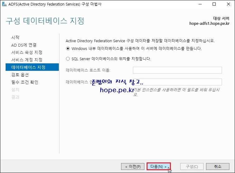 cf) 본 포스팅에서는 Windows 내부 데이터베이스를 사용하여 ADFS 서버에 데이터베이스를 생성하는 옵션을 선택했습니다. 조직 내부에 SQL Server가 존재한다면 해당 서버를 지정해도 됩니다.