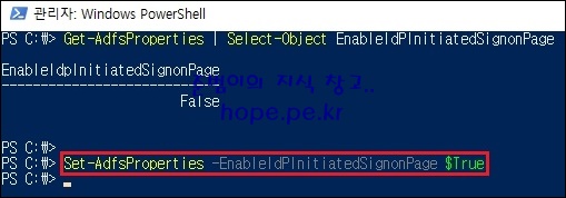 다음 cmdlet 명령어로 ‘EnableIdpInitiatedSignonPage’ 속성값을 ‘True’로 변경합니다.