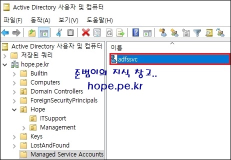 그리고 서비스 계정 지정을 하는 단계에서 사용할 ADFS 서비스 계정을 미리 생성하였습니다.