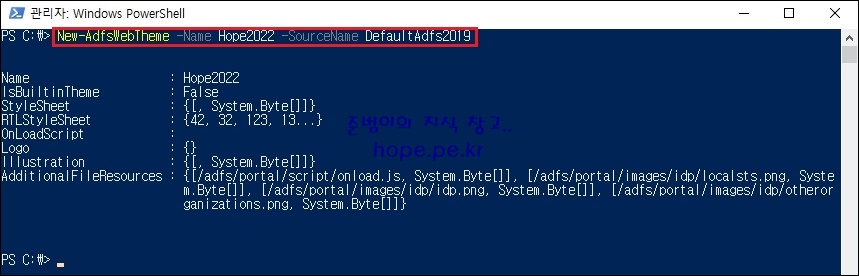다음 cmdlet을 실행하여, DefaultAdfs2019 테마를 복사하여 Hope2022 테마를 새로 만들어냅니다.