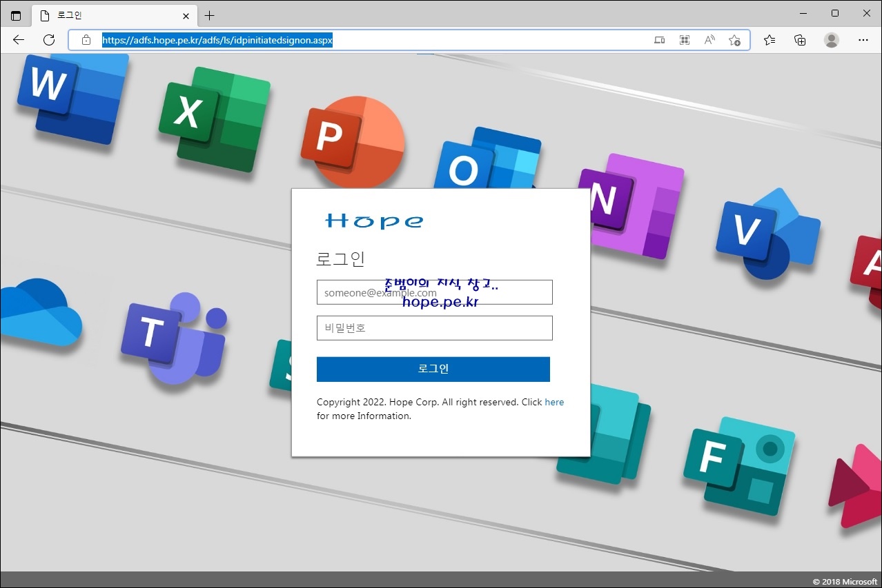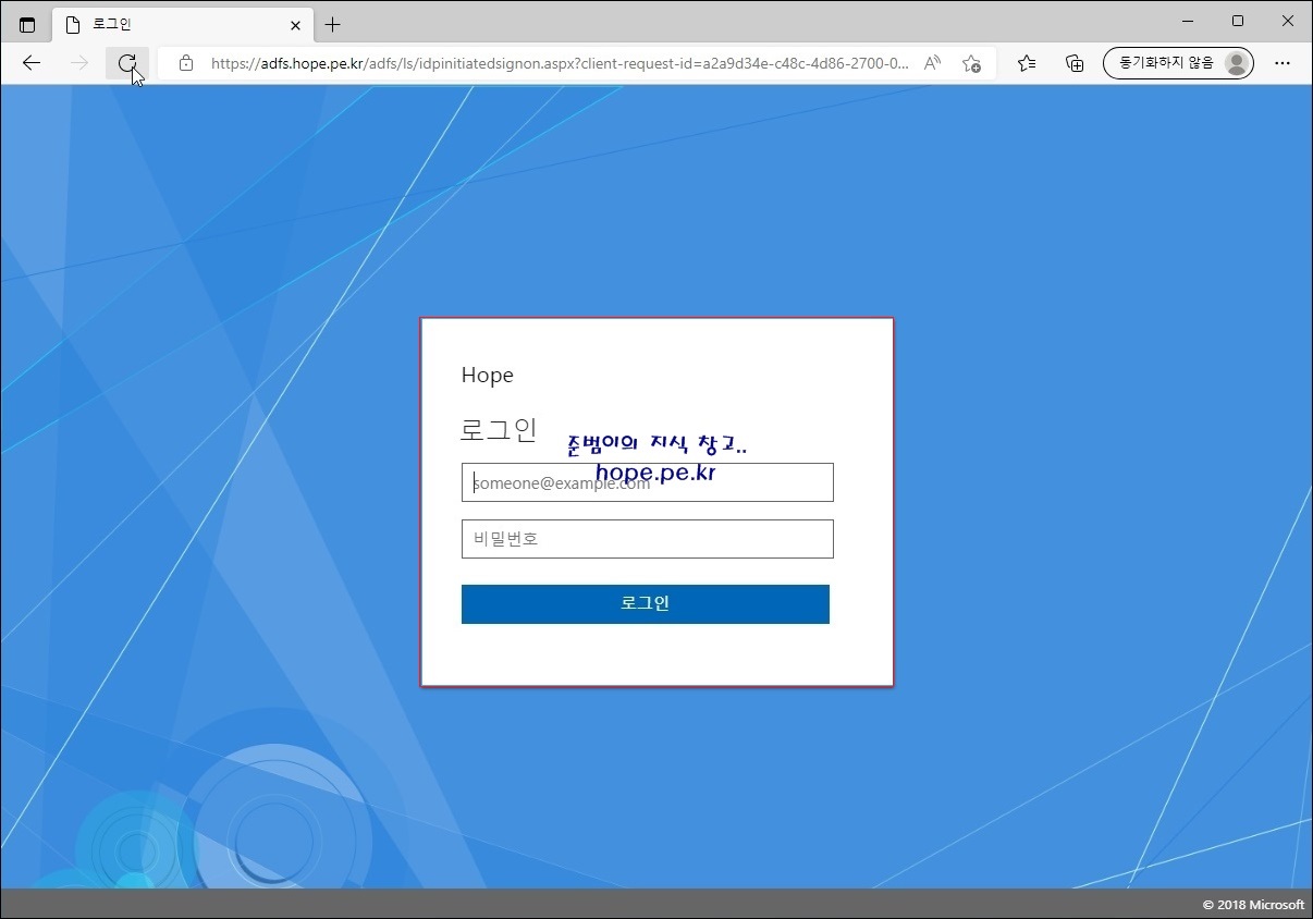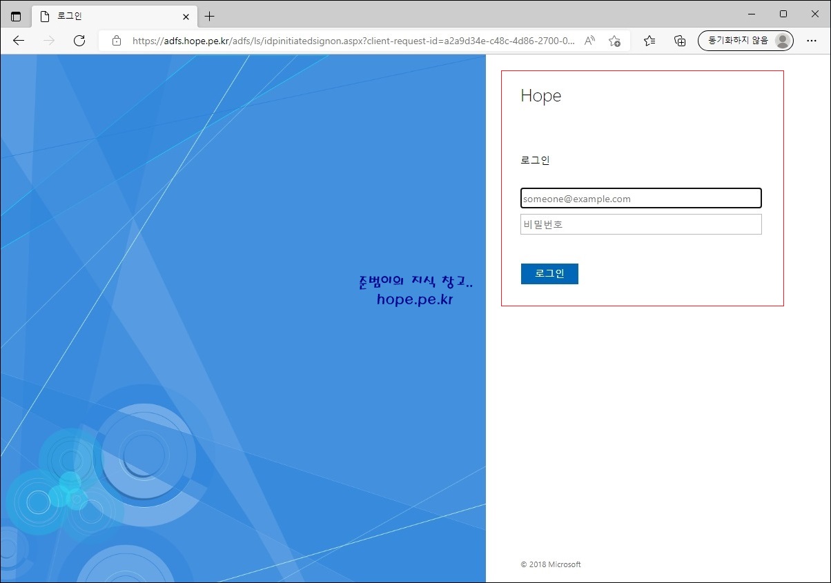 Windows Server 2019 환경에서, ADFS 구성후 로그인 페이지에 접속하면 Windows Server 2012 R2 및 2016 페이지와 동일하게, 로그인 UI가 오른쪽에 있는 화면에 접속 합니다.