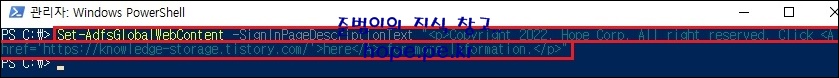 Set-AdfsGlobalWebContent -SignInPageDescriptionText "<p>Copyright 2022. Hope Corp. All right reserved. Click <A href='https://knowledge-storage.tistory.com/'>here</A> for more information.</p>"