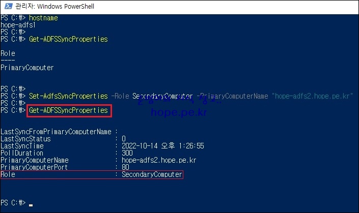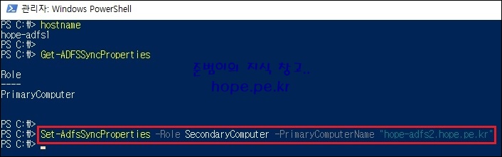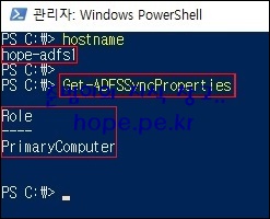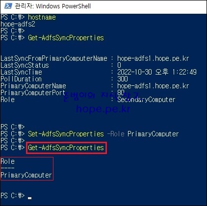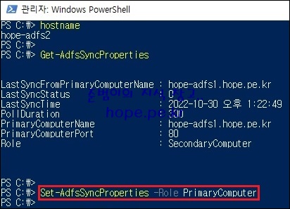 참고로 원래 주 페더레이션 서버(hope-adfs1) 에서 PowerShell 을 관리자 권한으로 실행 후 다음 cmdlet 을 실행하면, 아직 주 페더레이션 서버 역할로 표시 됩니다.