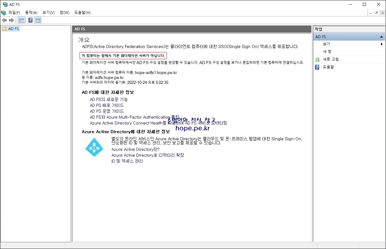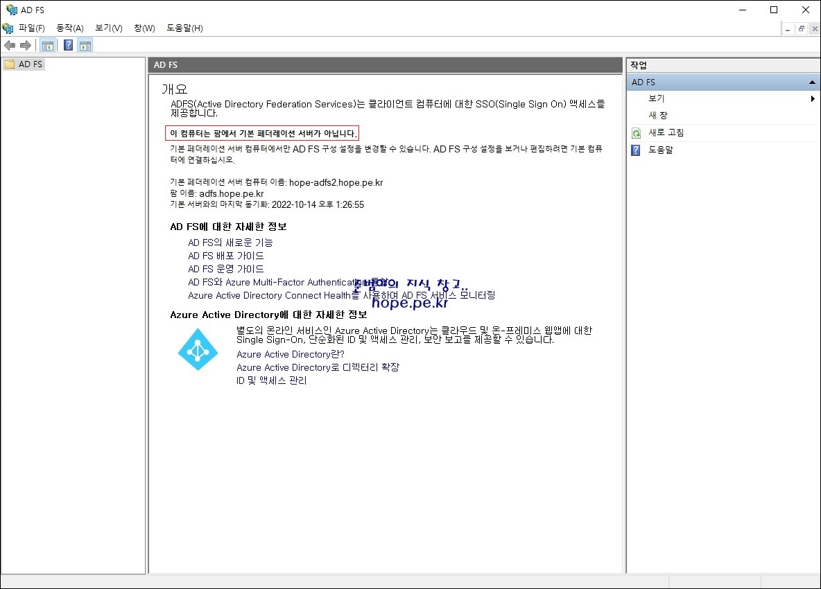 AD FS 관리 콘솔을 실행하면, 주 페더레이션 서버가 아니므로 관리 기능을 사용할 수 없습니다.