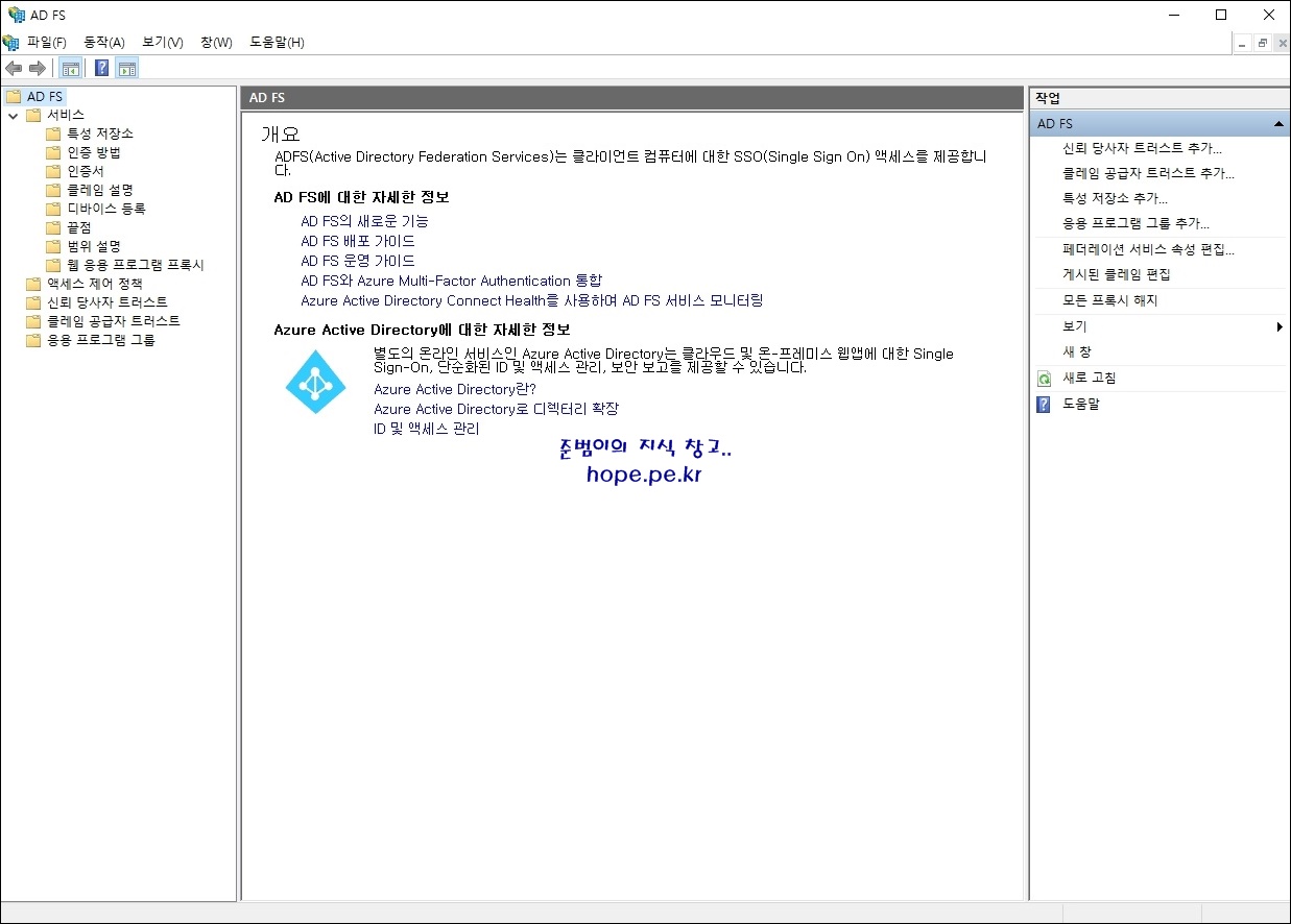 AD FS 관리 콘솔을 재 실행하면, 기본 역할이 전송되었기에 모든 관리자 기능이 표시 됩니다.