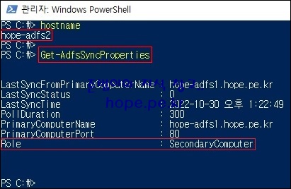 보조 페더레이션 서버(hope-adfs2) 에서 PowerShell 을 관리자 권한으로 실행 후 다음 cmdlet 을 실행 하여, 보조 페더레이션 서버 역할임을 확인 합니다.
