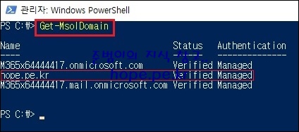 다음 cmdlet 명령어를 실행하여, 인증 방식이 ADFS 방식이 아님을 확인 합니다.
