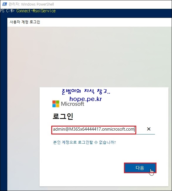 다음 cmdlet 명령어를 실행후, 사용자 계정 로그인 창의 로그인 화면에서 'Microsoft 365 전역 관리자 계정' 입력 후 '다음' 을 클릭 합니다.