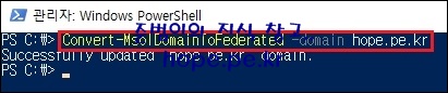 'Get-MsolDomain' 명령어를 실행하여 로그인 방식이 ADFS로 정상적으로 변경되었음을 확인 합니다.