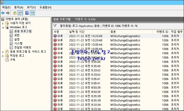 Exchange Server 2013 or 2016 을 운영하다 보면 특정 시점에 'Windows 로그 > 응용 프로그램' 로그에 'Event ID 1006, 원본 MSExchangeDiagnostics' 가 15분 간격으로 지속적으로 발생하는 경우가 있을 수 있습니다.